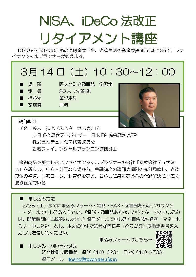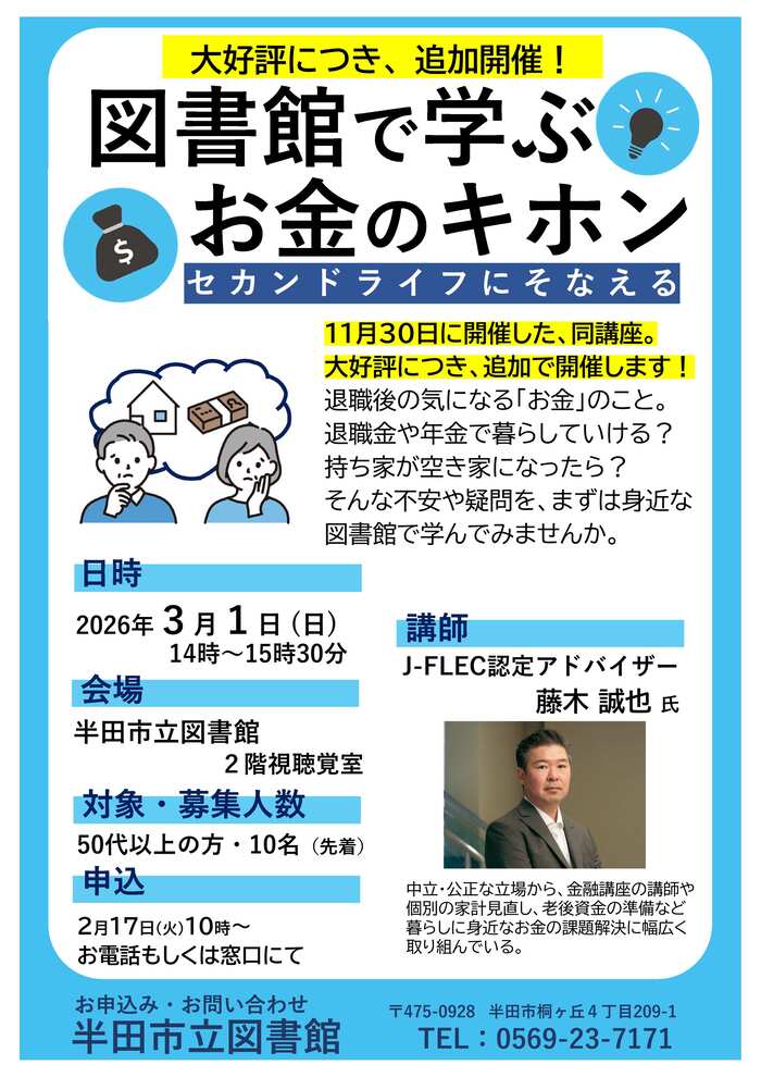 2026年2月23日 | 図書館で学ぶお金の話~セカンドライフの不安はありませんか~ | 主催:美濃加茂市中央図書館 |