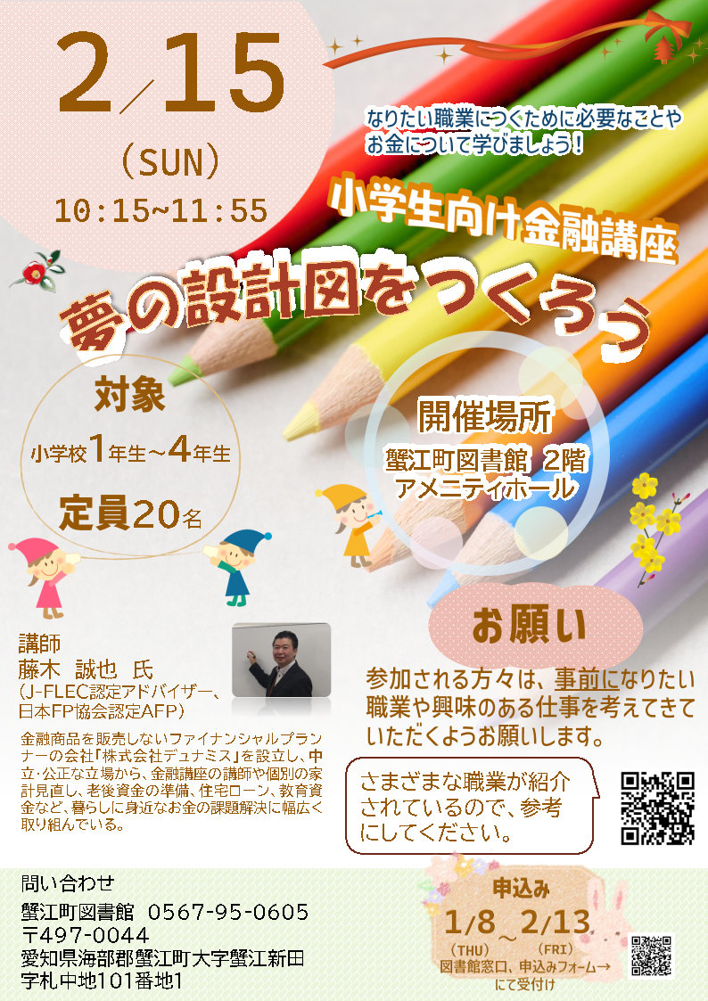 2025年2月8日 | ライフプランセミナー ~子どもの教育費と家庭の将来設計~ | 主催:江南市立図書館 |