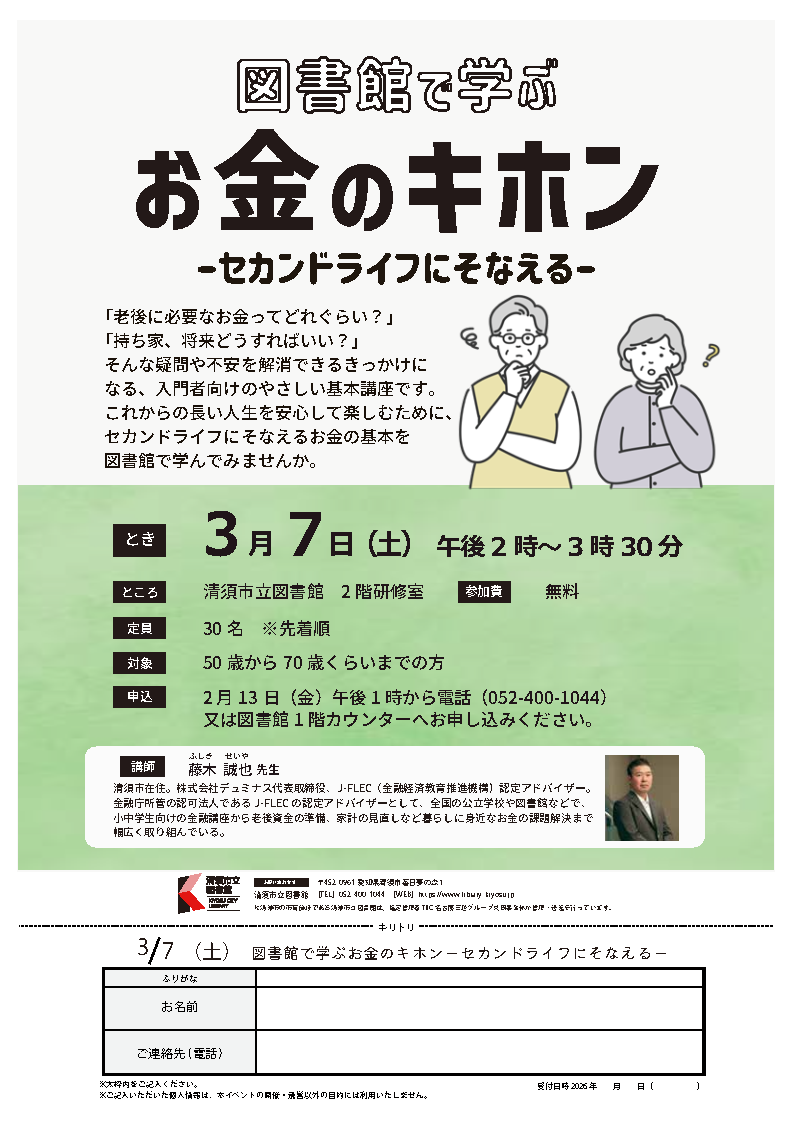 2025年3月15日 | 子どもの教育費準備に失敗しないためのマネープラン講座 | 主催:清須市立図書館 |